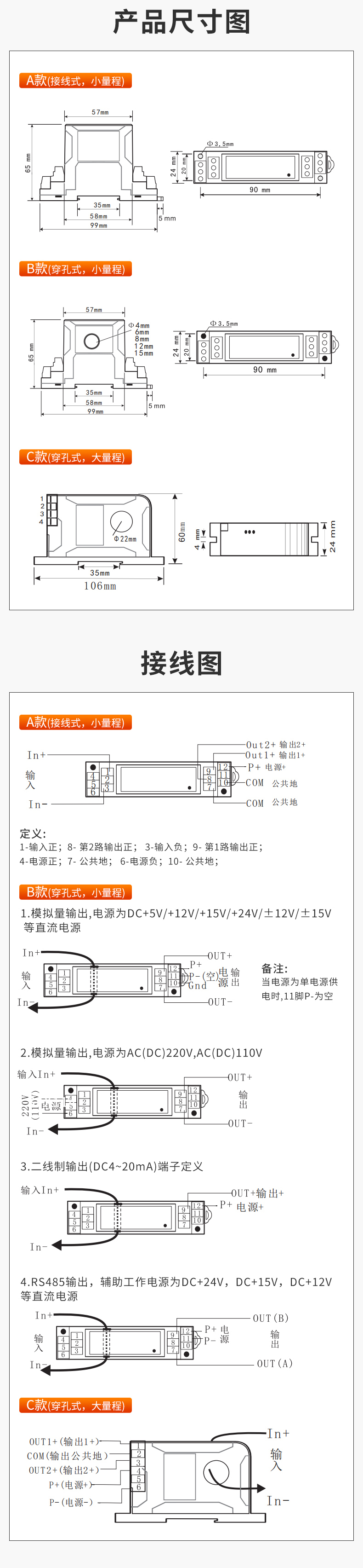 丰控大孔径0-1000A交流电流变送器输出信号:IV, 2V, 5V, DC0~20mA, DC4~20mA,二线制输出,RS485