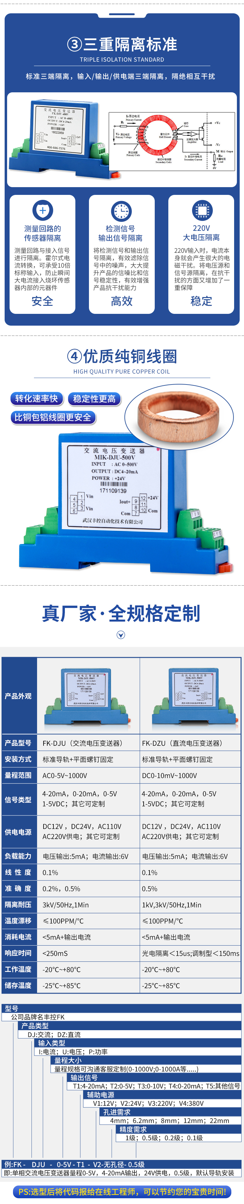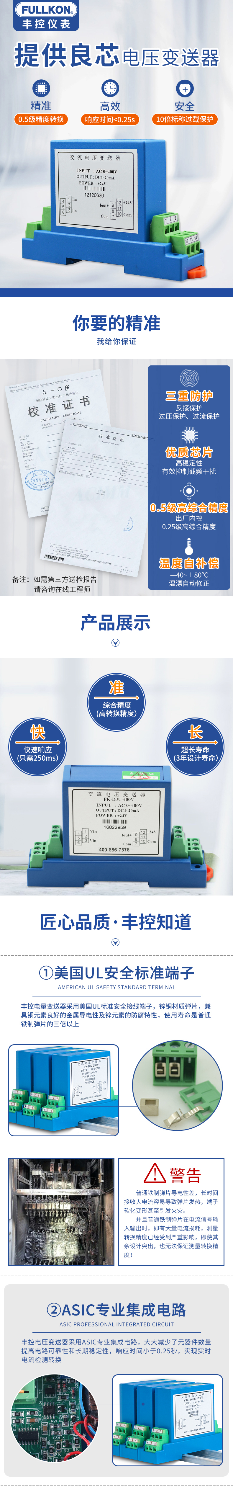 丰控FK-SJU三相交流直流电压变送器380V 4-20mA星型三角型220V